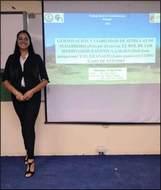 Estudiante del Doctorado en Ciencias Biológicas en la Facultad de Ciencias Exactas, Físicas y Naturales de la Universidad Nacional de San Juan. Becaria de CONICET con lugar de trabajo en el Centro de Investigación de la Geosfera y la Biósfera (CIGEOBIO-UNSJ). Especializada en Modelos de Distribución de Especies, ecología de mamíferos con el guanaco (Lama guanicoe) como especie en estudio.